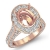 Alluringly distinct, this 14k Rose Gold and diamond engagement ring features an oval semi mount. It displays round pave diamonds in halo & along the shank. (2.1Ct. tw.)