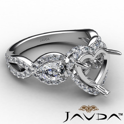 A symbol of lifelong love, this three stone heart shaped semi mount engagement ring. Features . of round diamonds along the halo & infinity shank, surround the