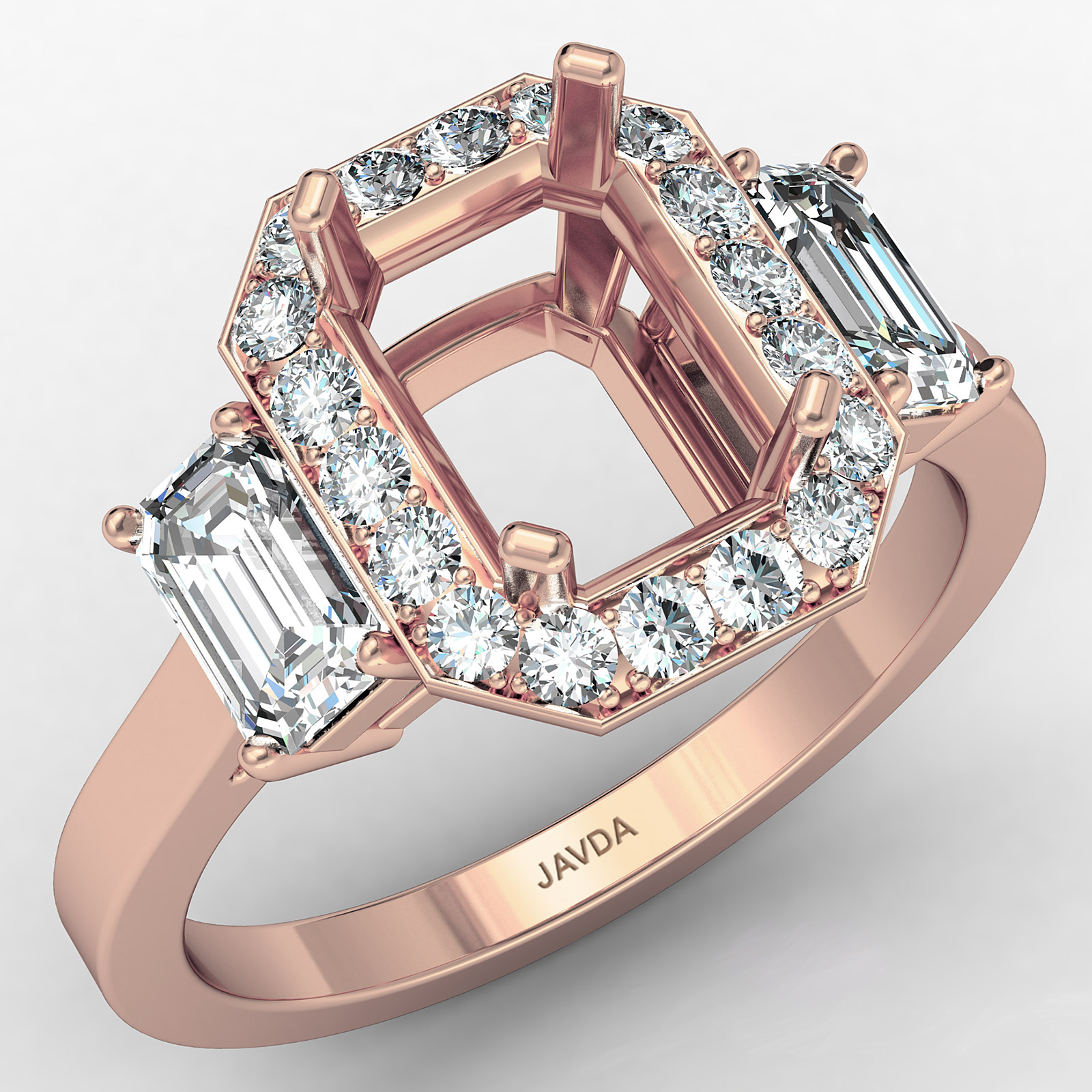 3 Stone Halo Diamond Engagement Emerald Semi Mount 14k Rose Gold Ring (0.78Ct. tw.)