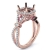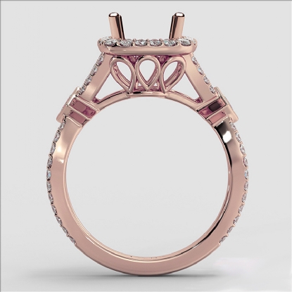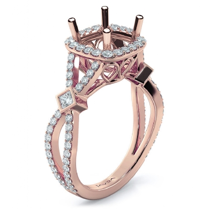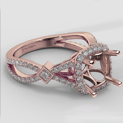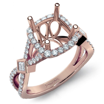 This diamond engagement ring is made in glorious 14k Rose Gold. This round cut semi mount ring features . round diamonds in halo U cut shared prong setting on halo & on the criss cross shank. It weights 4.6 grams (0.9Ct. tw.)
