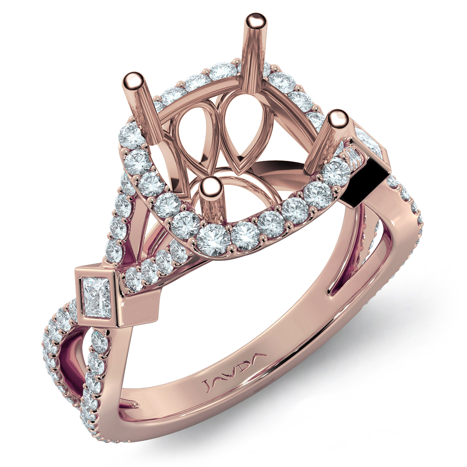This diamond engagement ring is made in glorious 18k Rose Gold. This round cut semi mount ring features . round diamonds in halo U cut shared prong setting on halo & on the criss cross shank. It weights 4.6 grams (0.9Ct. tw.)