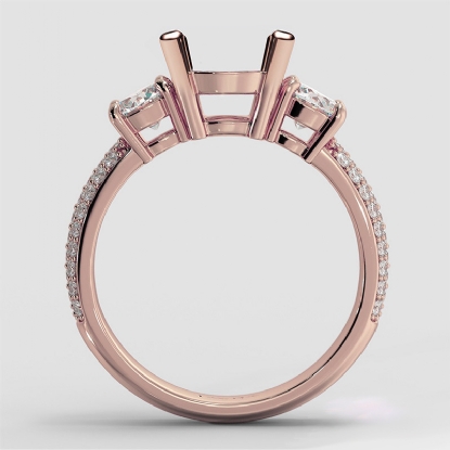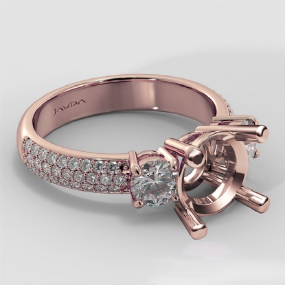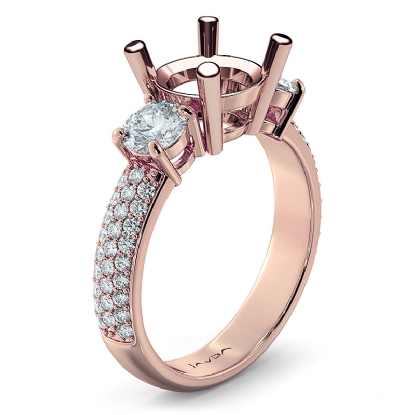 Eyes will be fixated on this one! This 3 stone round semi mount diamond engagement ring is made in 14k Rose Gold. It showcases . round prong diamonds in prong, pave & along the sparkling shank. It weights 3.8 gram. (0.9Ct. tw.)
