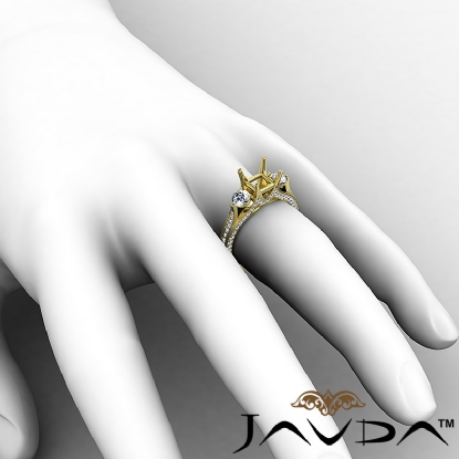 Glamorous and elegant, this three-stone semi mount ring triples the shimmer with . side diamonds intensifying the Princess center diamond in prong setting. The smaller