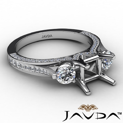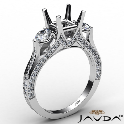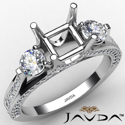 Glamorous and elegant, this three-stone semi mount ring triples the shimmer with . side diamonds intensifying the Princess center diamond in prong setting. The smaller