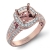 Graceful in design, this classic yet distinctive cushion semi mount engagement ring is made in 14k Rose Gold. It showcases . round diamonds in pave setting, that sparkle on the halo & the shank. It weights 7 7 gram. (0.8Ct. tw.)