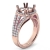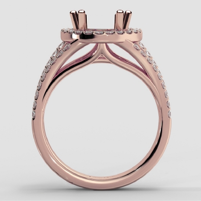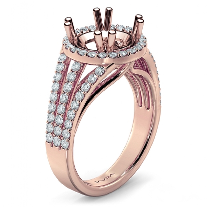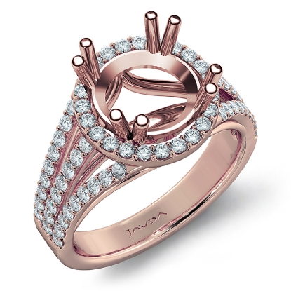 Forever timeless, this luxurious 14k Rose Gold engagement ring has a round semi mount. It showcases . Halo U Cut shared Prong set round diamonds in halo & along the shank and its 5.7 gram. (1Ct. tw.)