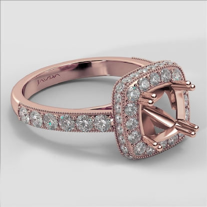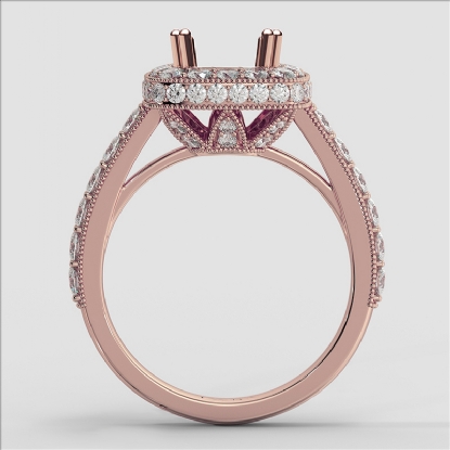 Lavishly showcasing your center cushion semi mount with brilliance, this diamond engagement ring is made in 14k Rose Gold. It features . halo pave set round diamonds in Milgrain halo & along the shank. It Weight 5.3 gram. (1.1Ct. tw.)