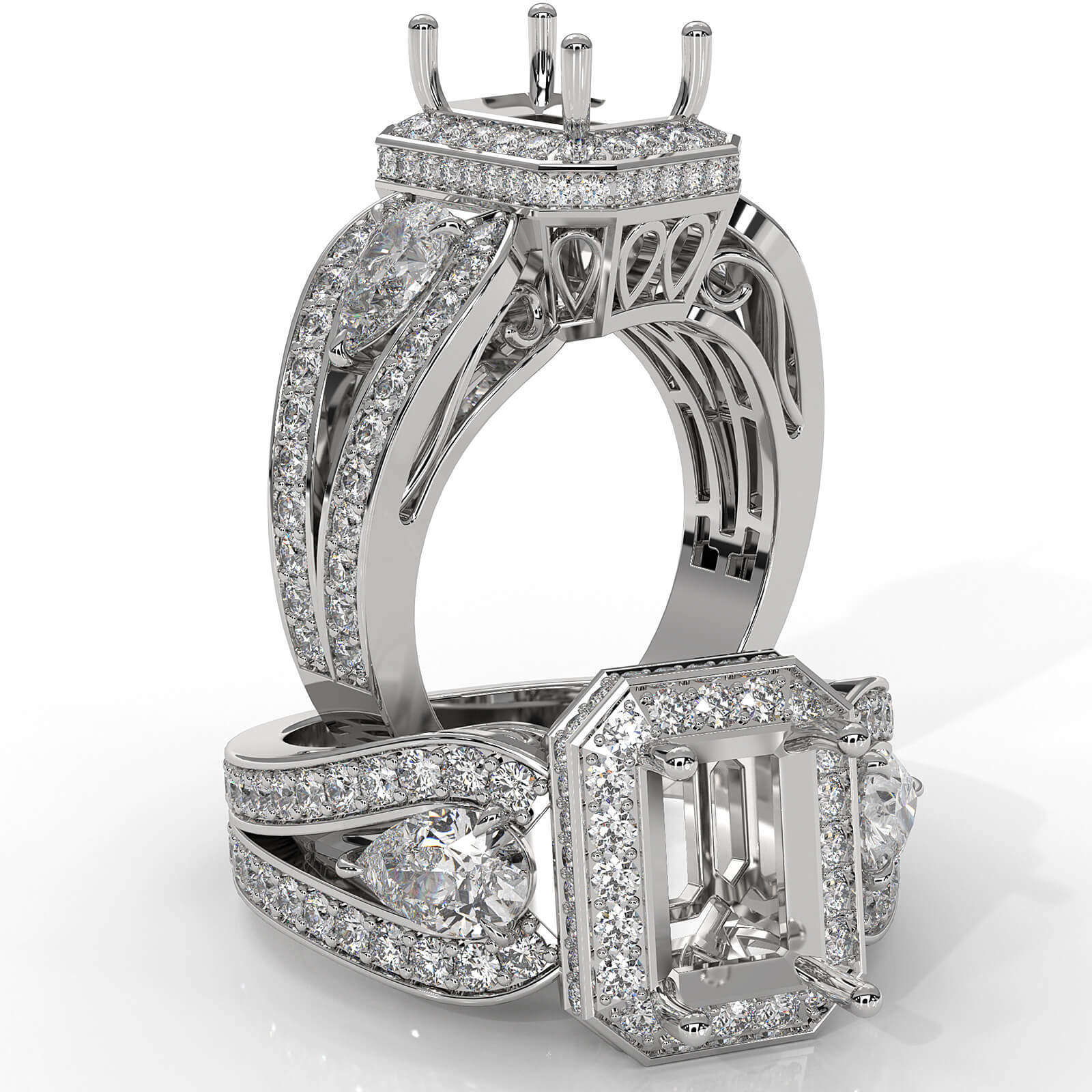 Emerald Diamond Engagement Halo 3Stone Ring Set 14k W Gold Semi Mount (1.85Ct. tw.)