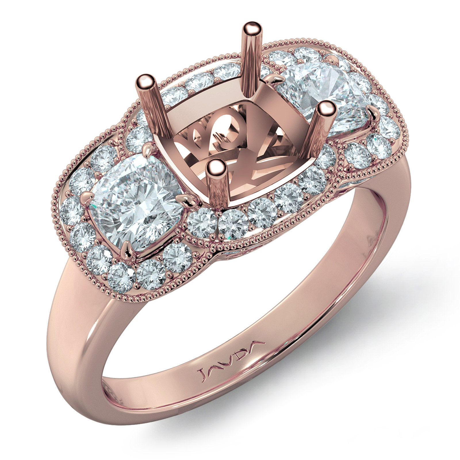 Diamond Engagement 3Stone Ring 14k Rose Gold Cushion Semi Mount Halo Band (1.05Ct. tw.)