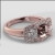 Alluringly distinct, this 18k Rose Gold and 3 Stone diamond engagement ring features a cushion semi mount. It displays . Halo Pave Set round diamonds in halo & along the shank. (1.05Ct. tw.)