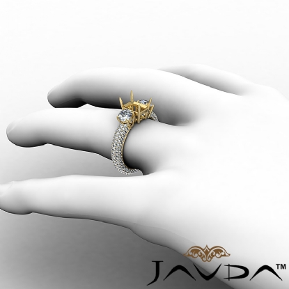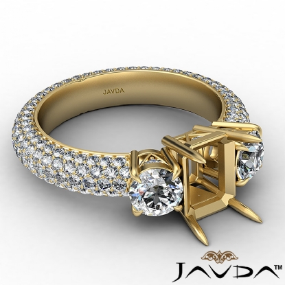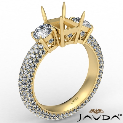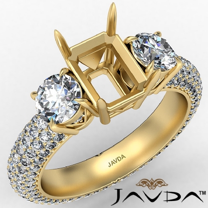 Beautiful in its own way! This & 18k Gold Yellow ring is scintillating. A semi mount emerald center diamond, clustered by two round cut side diamonds are all in prong setting. Pave set diamonds on the shank set the standards high! (2.64Ct. tw.)