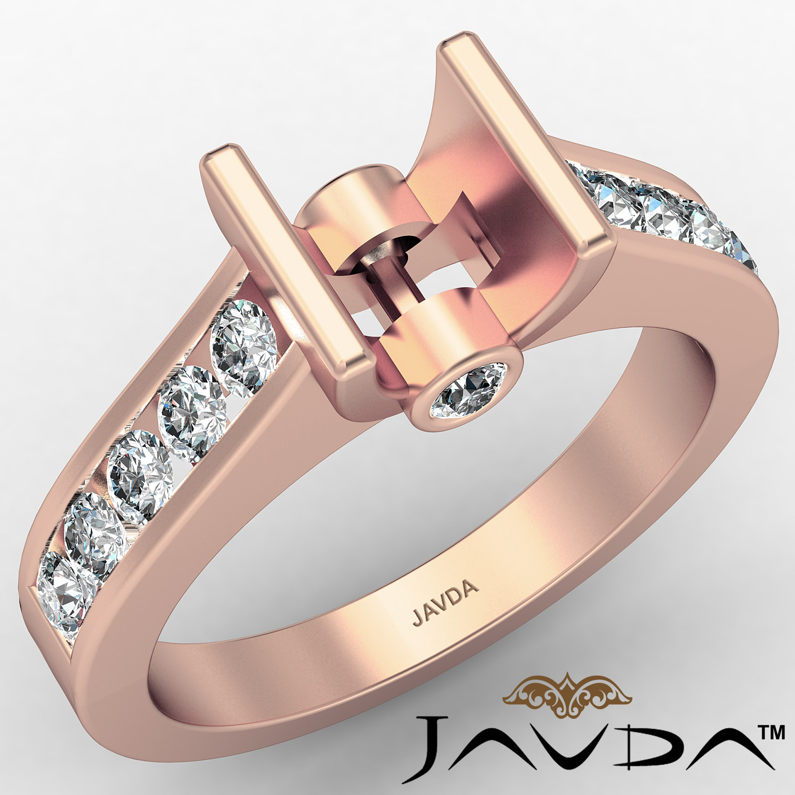 Undeniably striking, this diamond engagement ring is made in 18k Rose Gold. It features a cushion semi mount in bar setting with lustrous round diamonds along the shank in channel setting. (0.5Ct. tw.)