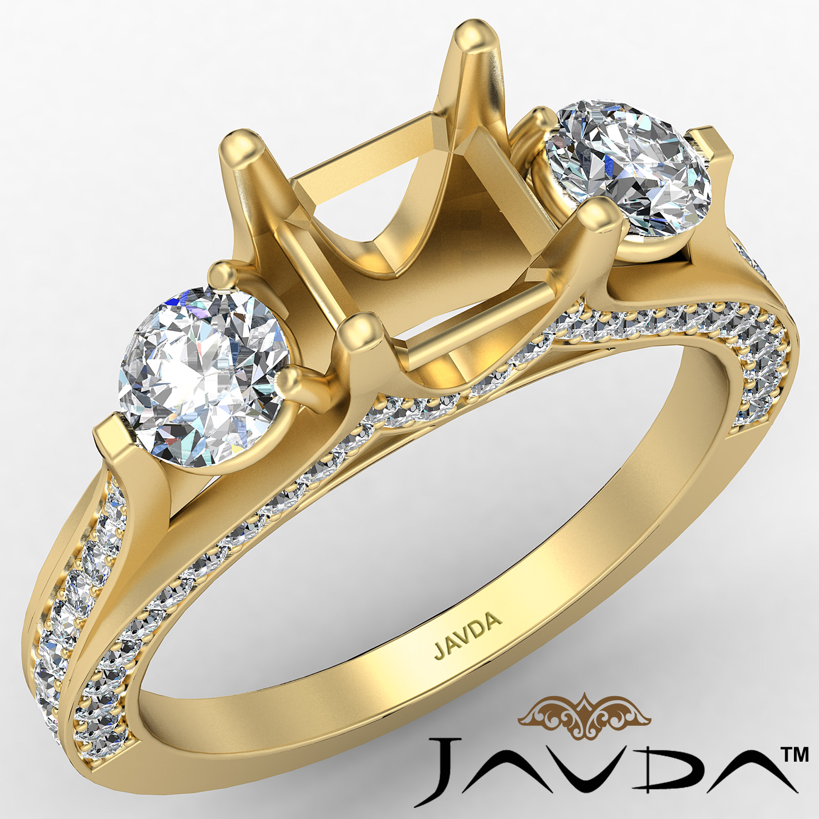 Glamorous and elegant, this three-stone semi mount ring triples the shimmer with . side diamonds intensifying the center diamond in prong setting. The smaller