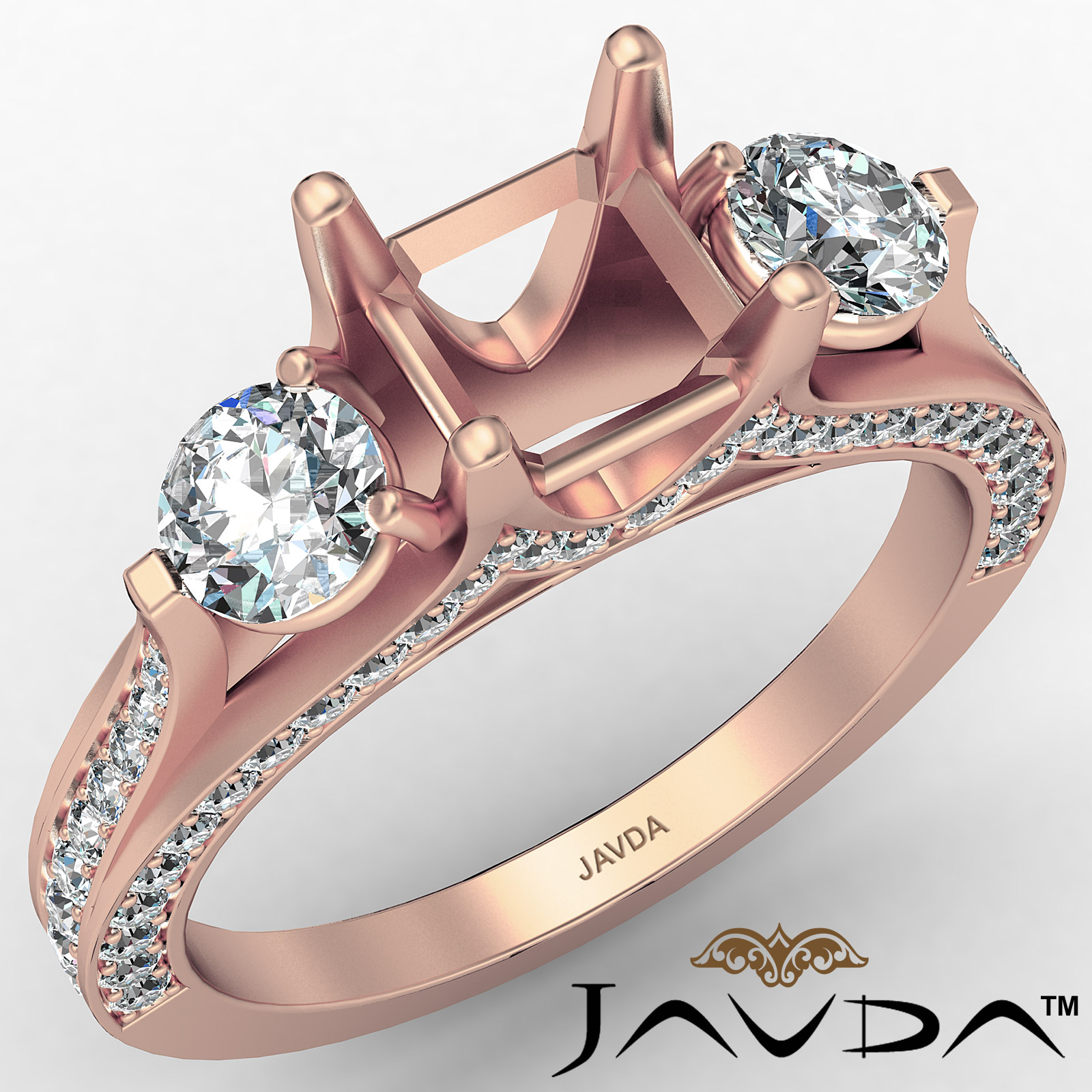 Glamorous and elegant, this three-stone semi mount ring triples the shimmer with . side diamonds intensifying the center diamond in prong setting. The smaller