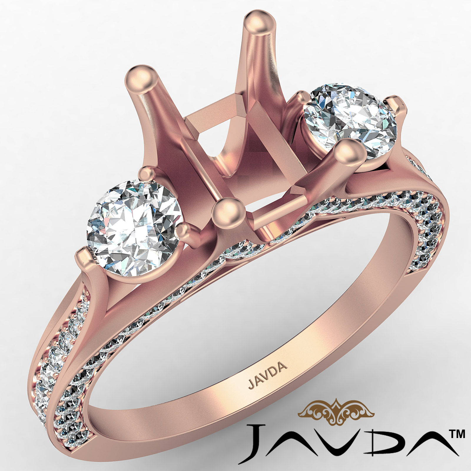Glamorous and elegant, this three-stone semi mount ring triples the shimmer with . side diamonds intensifying the center diamond in prong setting. The smaller