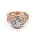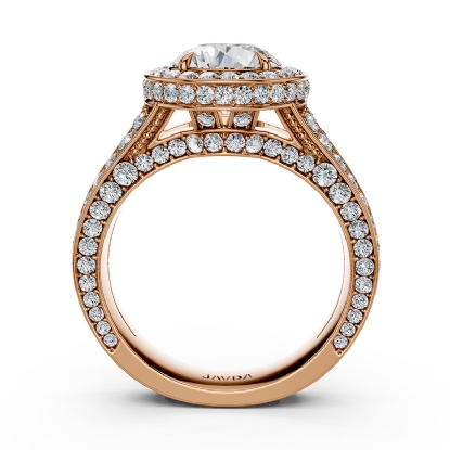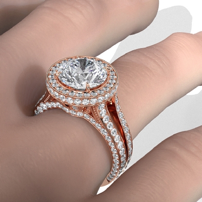 Made in 18k Rose Gold & unique in design, this . women's diamond engagement ring showcases a round semi-mount halo of round pave-set diamonds, along with split shank setting on the shank. (1.5Ct. tw.)