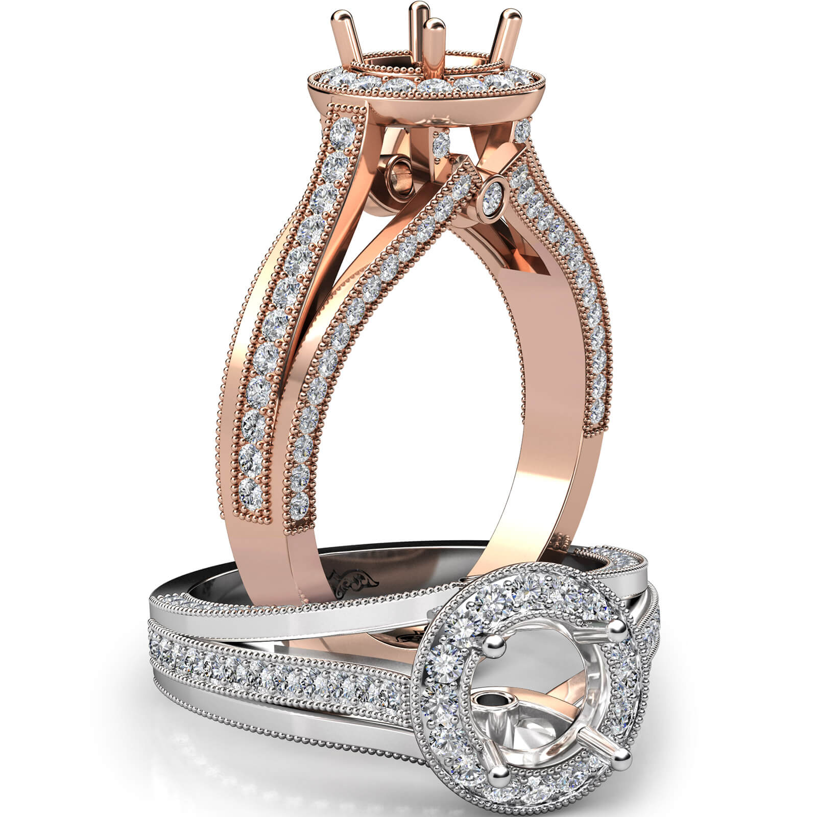 Halo Pave Diamond Engagement Round Semi Mount Millgrain Ring 14k Rose Gold (0.9Ct. tw.)