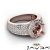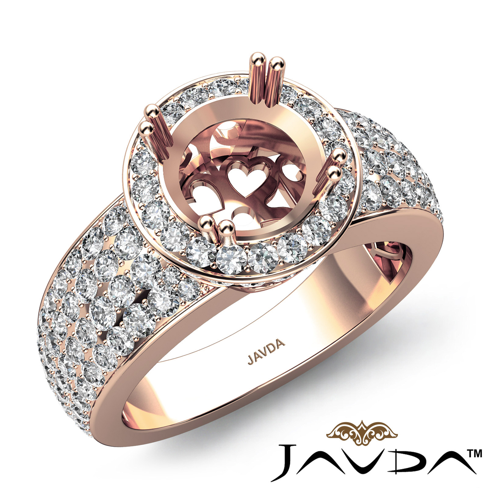 This strikingly sophisticated 18k Rose Gold engagement ring showcases your round semi mount in halo and a dazzling shank in pave set round diamonds. (2Ct. tw.)