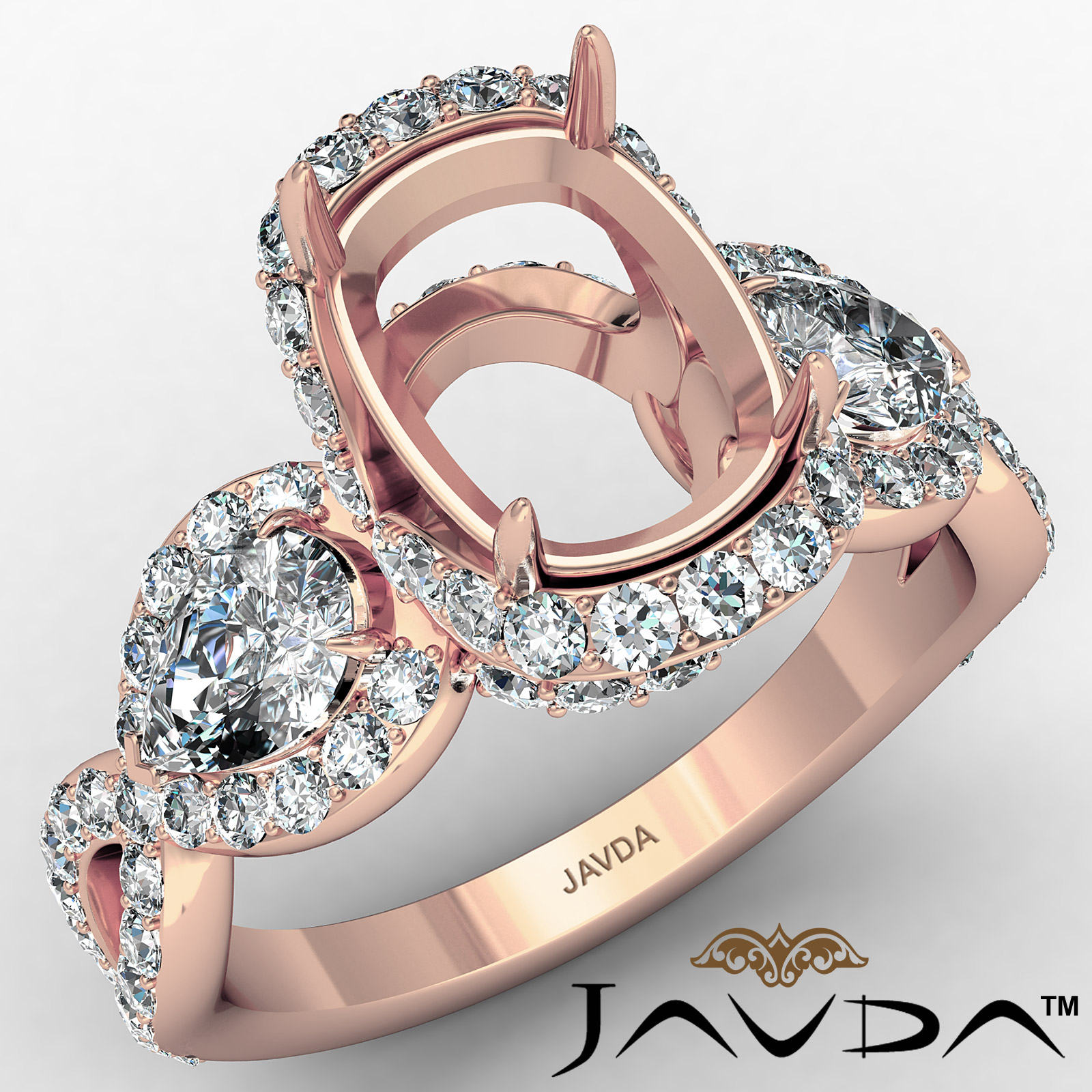 This semi mount blooming beauty features three pear shaped stones for a glamorous engagement ring. of round diamonds along the halo & shank, surround the