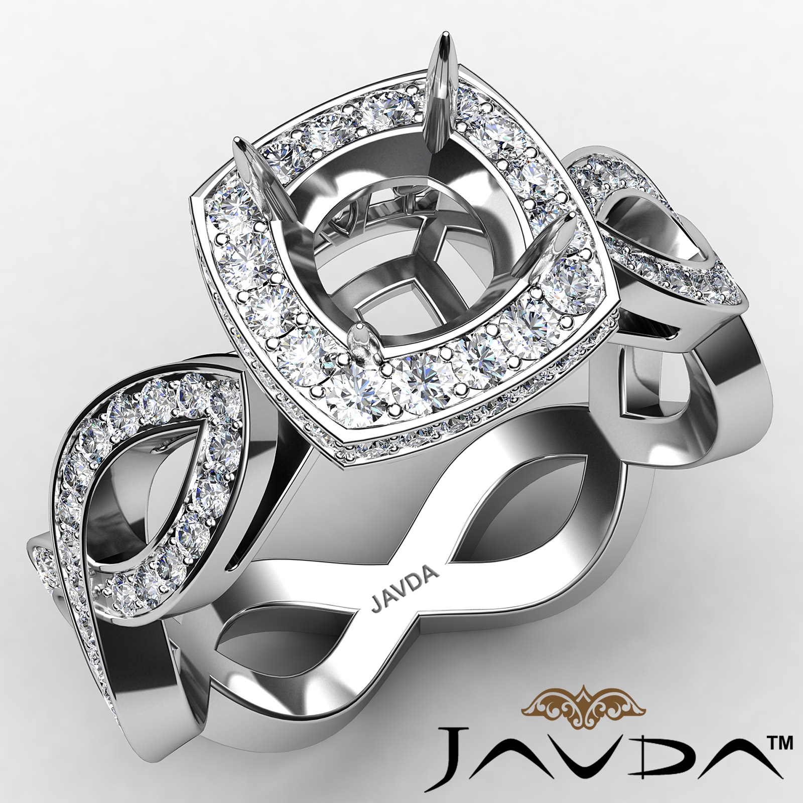 Undeniably striking, this 14k Gold White diamond engagement ring showcases a cushion semi mount in halo setting, with pave set round diamonds dazzling on the halo and the beautiful criss-cross shank. (1.3Ct. tw.)
