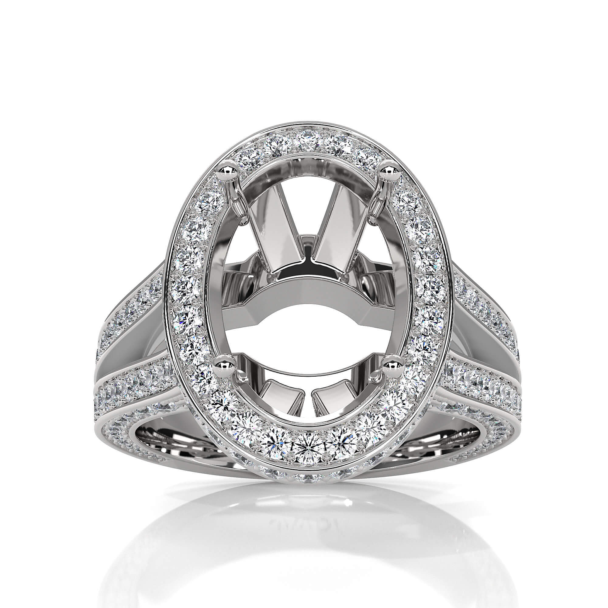 Made in 18k Gold White & unique in design, this . women's diamond engagement ring showcases a oval semi-mount halo of round pave-set diamonds, along with split shank setting on the shank. (1.5Ct. tw.)