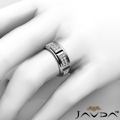 Classic luxurious 2 row round diamond eternity men's wedding band expertly crafted from the finest precious metal. This designer jewelry piece is perfect for modern groom. Features polished edges and vertical center cuts with 1.43 carat round diamonds in a micro pave setting. Available in 14k & 18k white gold, yellow gold, rose gold and platinum 950. (1.43Ct. tw.)