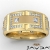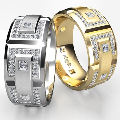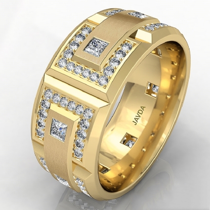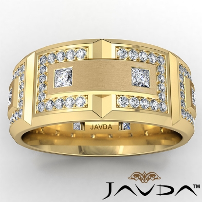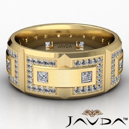 A perfect peice of jewelry for modern groom link design diamond eternity men's wedding band crafted in 14k Gold Yellow. Features round diamonds in a micro pave setting and princess diamond in a bezel setting on matte finished with vertical grooved in polished finish. Available in 14k & 18k white gold, yellow gold, rose gold and platinum 950. (1.35Ct. tw.)