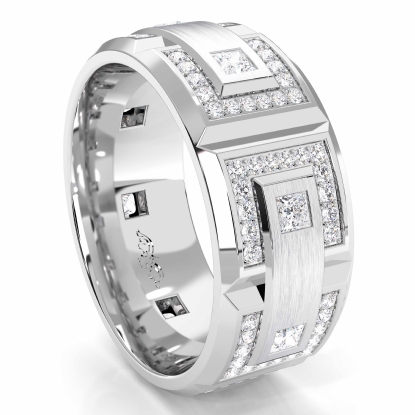 A perfect peice of jewelry for modern groom link design diamond eternity men's wedding band crafted in Platinum 950. Features round diamonds in a micro pave setting and princess diamond in a bezel setting on matte finished with vertical grooved in polished finish. Available in 14k & 18k white gold, yellow gold, rose gold and platinum 950. (1.35Ct. tw.)