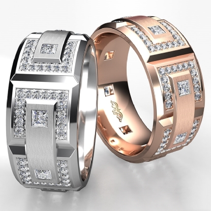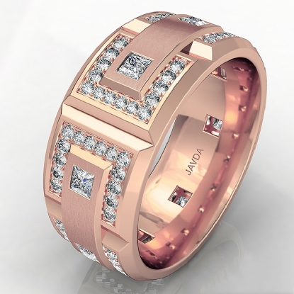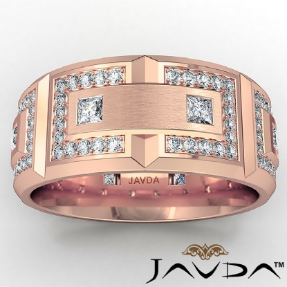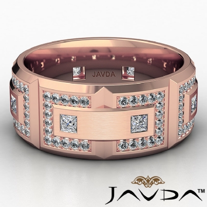 A perfect peice of jewelry for modern groom link design diamond eternity men's wedding band crafted in 14k Rose Gold. Features round diamonds in a micro pave setting and princess diamond in a bezel setting on matte finished with vertical grooved in polished finish. Available in 14k & 18k white gold, yellow gold, rose gold and platinum 950. (1.35Ct. tw.)