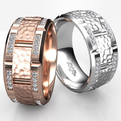 This stylish hammered finish diamond eternity men's wedding band crafted in Platinum 950. Features 0.50 carat round diamonds in a micro pave setting and polished finish edges with the contrasting textures of hammered in center. Available in 14k & 18k white gold, yellow gold, rose gold and platinum 950. (0.5Ct. tw.)