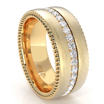 Simple yet classy this matte finish diamond eternity men's wedding band crafted in 18k Gold Yellow. Features 1.10 carat round diamonds in a micro pave setting in center of matte finish side dome with polished rope edges. Available in 14k & 18k white gold, yellow gold, rose gold and platinum 950. (1.1Ct. tw.)