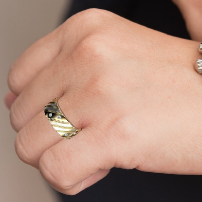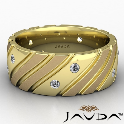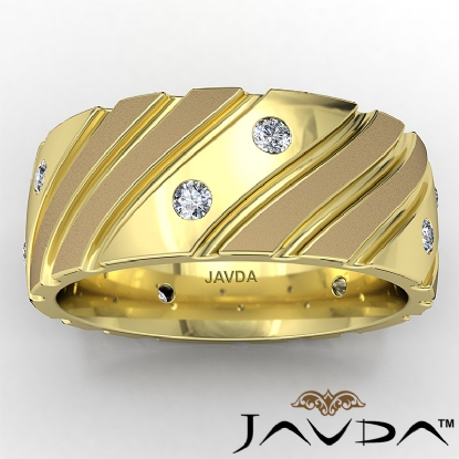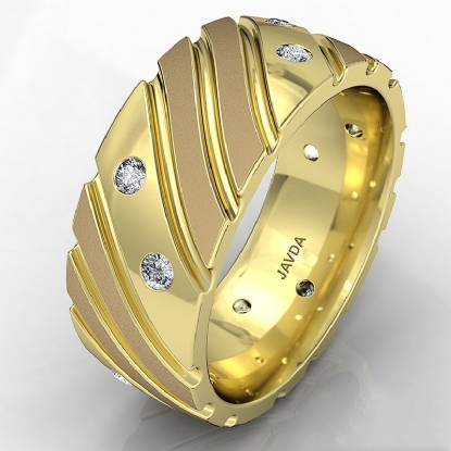 Modern yet stylish matte & polished finish bezel set diamond eternity men's wedding band made in 14k Gold Yellow. This wedding band features 0.30 carat round diamonds in a bezel setting with diagonal grooved in polished and matte finished dome surface. Available in 14k & 18k white gold, yellow gold, rose gold and platinum 950. (0.3Ct. tw.)