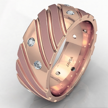 Modern yet stylish matte & polished finish bezel set diamond eternity men's wedding band made in 14k Rose Gold. This wedding band features 0.30 carat round diamonds in a bezel setting with diagonal grooved in polished and matte finished dome surface. Available in 14k & 18k white gold, yellow gold, rose gold and platinum 950. (0.3Ct. tw.)