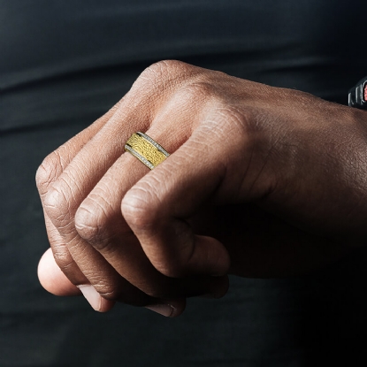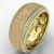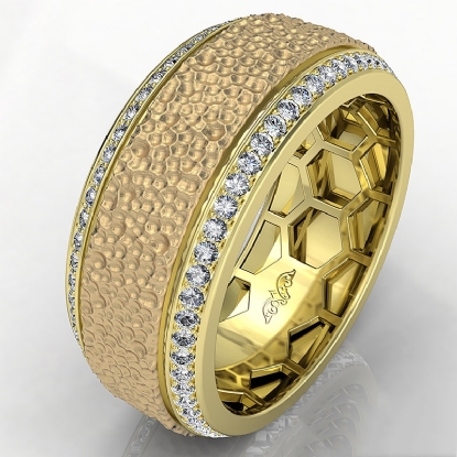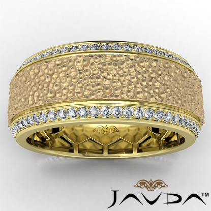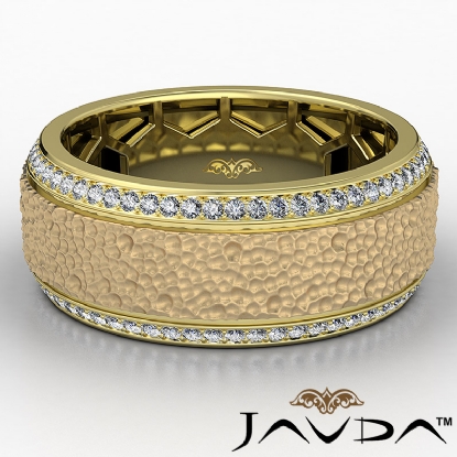 A stunning contemporary hammered finish diamond eternity men's wedding band made in 14k Gold Yellow. Features 1.00 carat round diamonds in a micro pave setting on edges and hammered finish center with a beautiful hexagon filigree inside. Available in 14k & 18k white gold, yellow gold, rose gold and platinum 950. (1Ct. tw.)