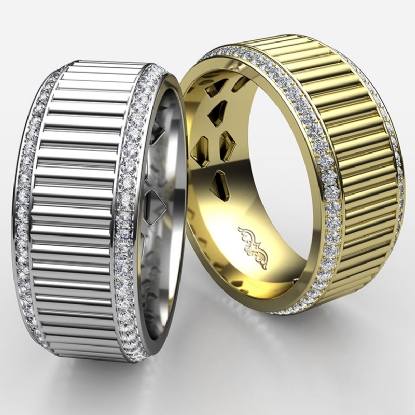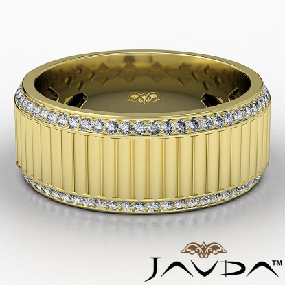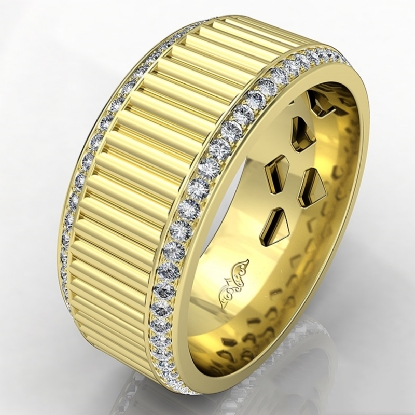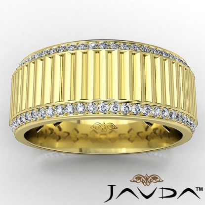 Designer vertical grooves diamond eternity men's wedding band handcrafted in 18k Gold Yellow. This modern design wedding ring features 1.00 carat round diamonds in a micro pave setting with polished finish vertical grooves. Available in 14k & 18k white gold, yellow gold, rose gold and platinum 950. (1Ct. tw.)