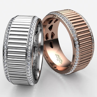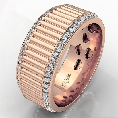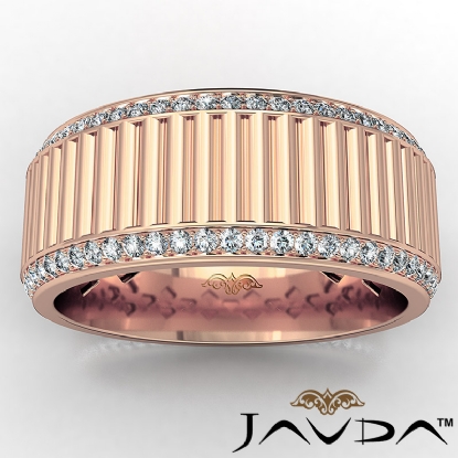 Designer vertical grooves diamond eternity men's wedding band handcrafted in 14k Rose Gold. This modern design wedding ring features 1.00 carat round diamonds in a micro pave setting with polished finish vertical grooves. Available in 14k & 18k white gold, yellow gold, rose gold and platinum 950. (1Ct. tw.)