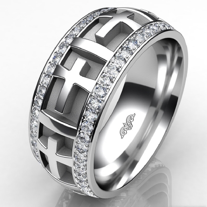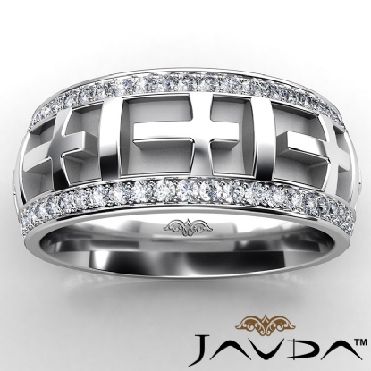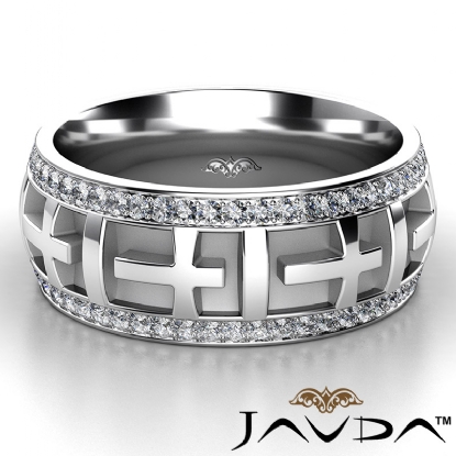 Modern diamond eternity cross pattern men's wedding band crafted in 18k Gold White. This statement piece features 1.2 carat round diamonds in a micro pave setting on edges and cross design in a center. Available in 14k & 18k white gold, yellow gold, rose gold and platinum 950. (1.2Ct. tw.)