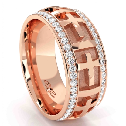 Modern diamond eternity cross pattern men's wedding band crafted in 14k Rose Gold. This statement piece features 1.2 carat round diamonds in a micro pave setting on edges and cross design in a center. Available in 14k & 18k white gold, yellow gold, rose gold and platinum 950. (1.2Ct. tw.)