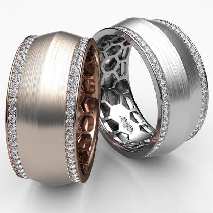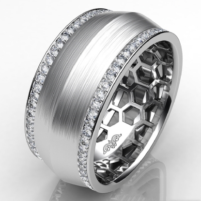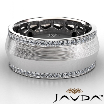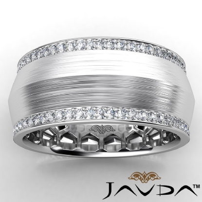 High quality knife edge diamond eternity men's wedding band crafted in 18k Gold White. This comfort fit wedding band features 1.25 carat round diamonds in a micro pave setting and matte finish knife edge in center. Available in 14k & 18k white gold, yellow gold, rose gold and platinum 950. (1.25Ct. tw.)