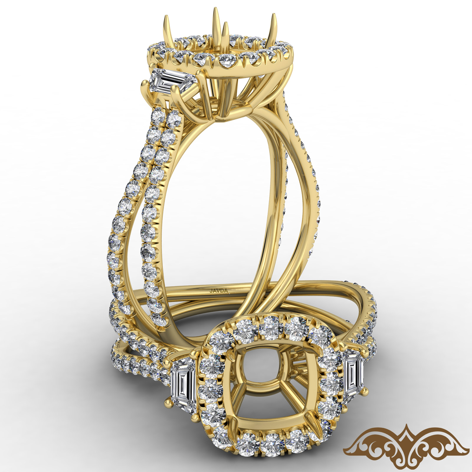 3 Stone Baguette Cushion Semi Mount Halo Diamond Engagement Ring 18k Gold (1.1Ct. tw.)