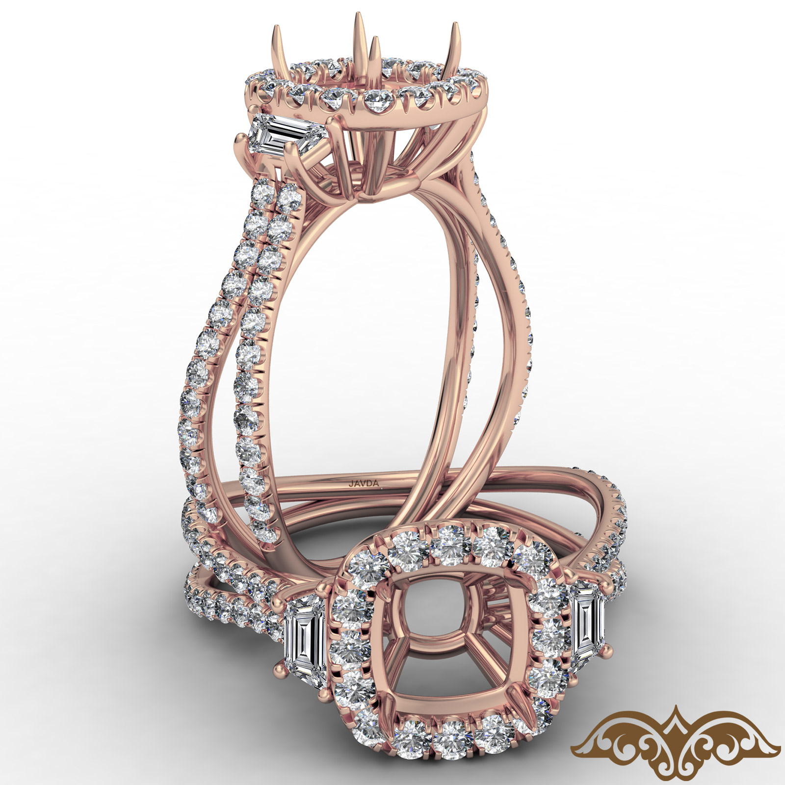 3 Stone Baguette Cushion Semi Mount Halo Diamond Engagement Ring 18k Rose Gold (1.1Ct. tw.)