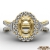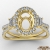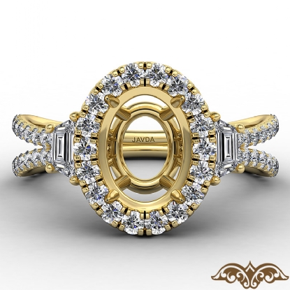 Three stone women's oval diamond engagement ring crafted in 18k Gold Yellow. This halo diamond ring features split shank and oval cut semi mount with side diamonds in a french U split pave set and