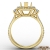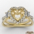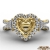 Three stone heart diamond engagement ring made from 18k Gold Yellow. This diamond ring features heart cut semi mount with side diamonds in a french U split pave setting on halo and split shank and