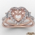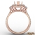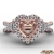 Three stone heart diamond engagement ring made from 14k Rose Gold. This diamond ring features heart cut semi mount with side diamonds in a french U split pave setting on halo and split shank and