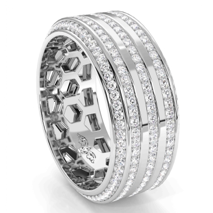 Stunning 5 row men's diamond eternity wedding band made in Platinum 950. This dazzling piece features 1.70 carat round diamonds in a micro pave setting with beautiful hexagon cuts inside. Available in 14k & 18k white gold, yellow gold, rose gold and platinum 950. (1.7Ct. tw.)