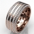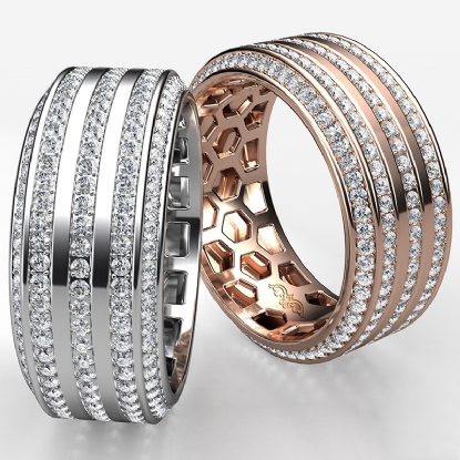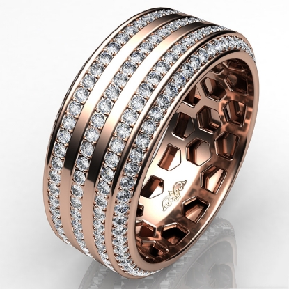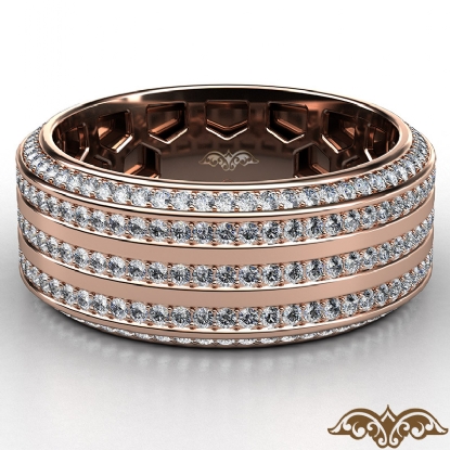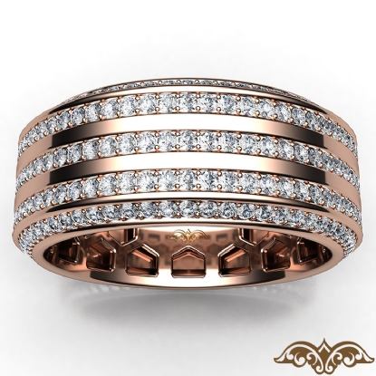Stunning 5 row men's diamond eternity wedding band made in 14k Rose Gold. This dazzling piece features 1.70 carat round diamonds in a micro pave setting with beautiful hexagon cuts inside. Available in 14k & 18k white gold, yellow gold, rose gold and platinum 950. (1.7Ct. tw.)