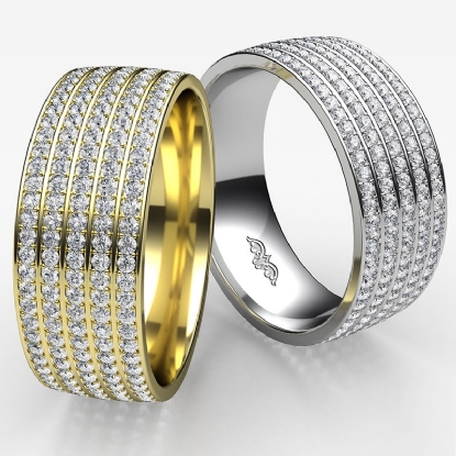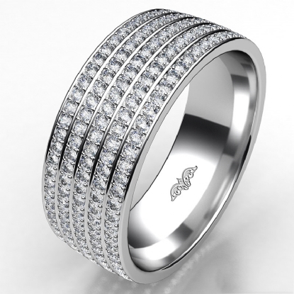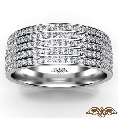 Luxurious and shimering 5 row diamond men's eternity wedding band elegantly crafted in 18k Gold White. Features 1.50 carat round diamonds in a micro pave setting. This dazzling wedding band available in 14k & 18k white gold, yellow gold, rose gold and platinum 950. (1.5Ct. tw.)