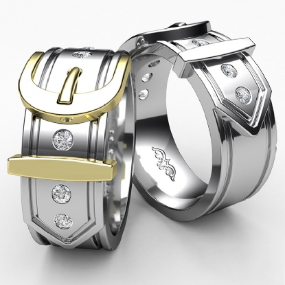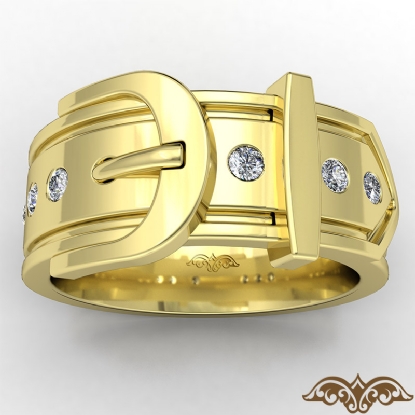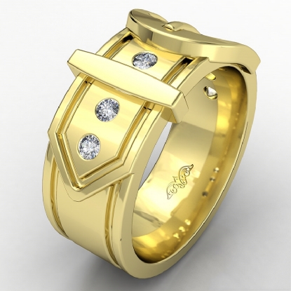 Amazing buckle design men's diamond wedding band handcrafted in polished finish 14k Gold Yellow. This unique piece features 0.20 carat round diamonds in a bezel setting on beautiful two tone belt buckle pattern. Available in 14k & 18k white gold, yellow gold, rose gold, two tone gold and platinum 950. (0.2Ct. tw.)