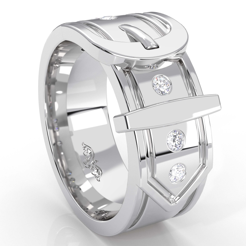 Amazing buckle design men's diamond wedding band handcrafted in polished finish 14k Gold White. This unique piece features 0.20 carat round diamonds in a bezel setting on beautiful two tone belt buckle pattern. Available in 14k & 18k white gold, yellow gold, rose gold, two tone gold and platinum 950. (0.2Ct. tw.)