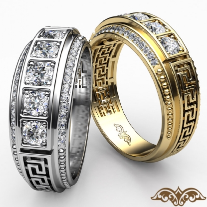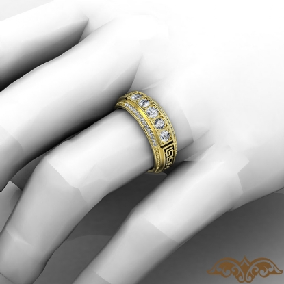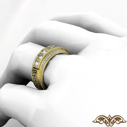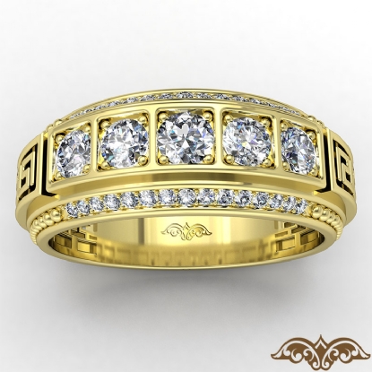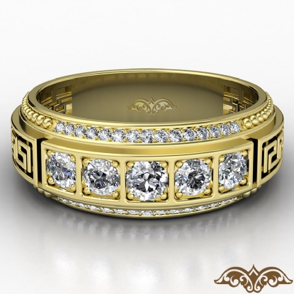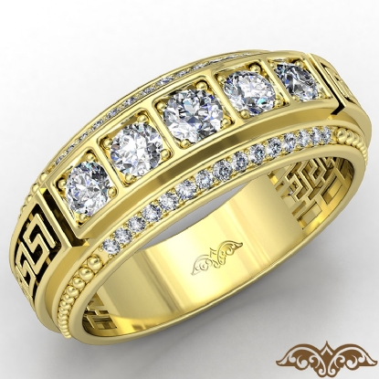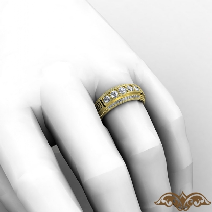Bold and stylish maze patterned men's diamond wedding band made in 14k Gold Yellow. Features 0.75 carat graduated round diamonds on top and tiny round diamonds on edges in a micro pave setting, the maze design adding a unique style to this ring. Add some fashionable to your look, available in 14k & 18k white gold, yellow gold, rose gold, and platinum 950. (0.75Ct. tw.)